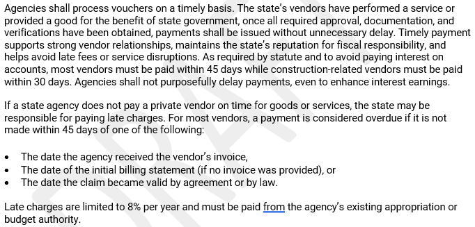 These proposed OAMs were updated to reflect the Governor's priority to promptly pay our vendors, especially those that are small businesses. As a result, paragraph 141 of OAM 10.20.00.PR<https://www.oregon.gov/das/Financial/Acctng/Documents/10.20.00.pr.pdf> and paragraph 121 of OAM 10.40.00<https://www.oregon.gov/das/Financial/Acctng/Documents/10.40.00.pdf> of the current OAMs were modified, and both are now proposed to state the following: