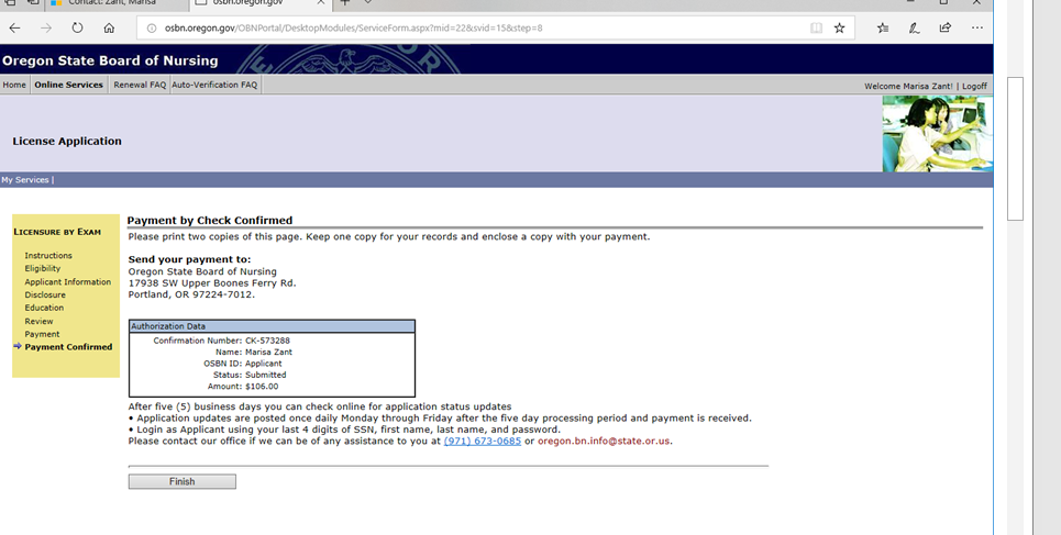 In order to make this a smoother process for everyone, remember that the Board is unable to temporarily hold money while waiting for a completed application. We cannot apply a payment to a document that we don't have yet. Thus, have your students print out or make a screenshot of the final submission page from the online application and submit a copy with the payment. It is very helpful for the licensing staff and fiscal technician to have this page with the payment, whether the payment comes from the test candidate or from the training program. The final submission page looks like: