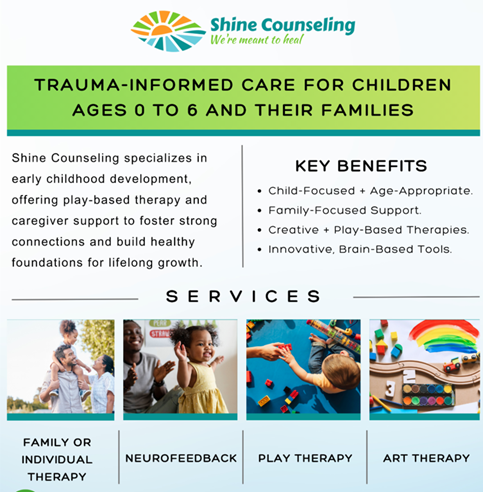 Shine counseling specializes in early childhood development, offering play-based therapy and caregiver support to foster strong connections and build healthy foundations for lifelong growth.