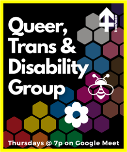[Queer, Trans, & Disability Group logo] - TransPonder- Queer, Trans & Disability Group meets Thursdays @ 7p on Google Meet. FREE! -