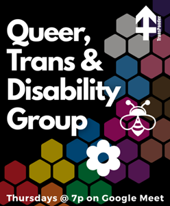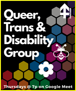 [Queer, Trans, & Disability Group logo] - TransPonder- Queer, Trans & Disability Group meets Thursdays @ 7p on Google Meet. FREE! -