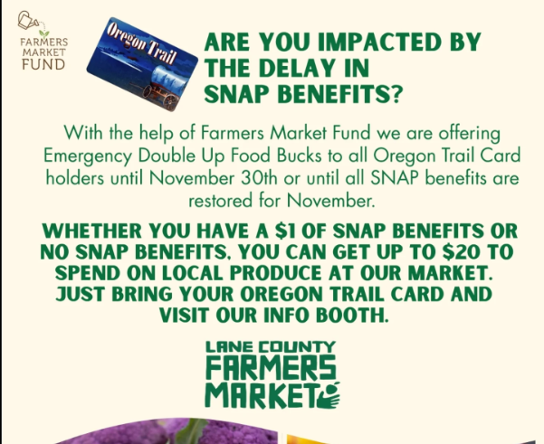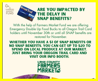 With the help of Farmers Market Fund we are offering Emergency Double Up Food Bucks to all Oregon Trail Card holders until November 30th or until all SNAP benefits are restored for November. Whether you have $1 of SNAP benefits or NO SNAP benefits, you can get up to $20 to spend on local produce at our market.