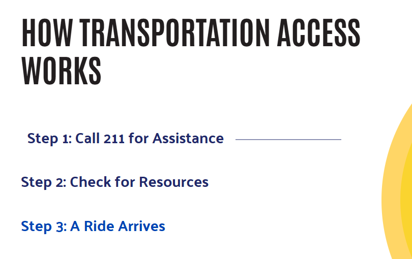 Transportation is vital for accessing essential services. United Way's Ride United program ensures equitable access through innovative solutions. Ride United leverages the strength of United Ways, the 211 network, and our partners to address the unmet transportation needs of individuals and families across the country. Transportation Access<https://www.unitedway.org/ride-united/ride-united-transportation-access> reduces travel barriers to essential jobs, services, and more. Our partnership with Lyft enables 211 callers to request transportation to an essential location and receive a ride for free or discounted rate, while the driver is still paid at a normal rate.