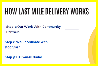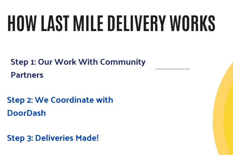 Last Mile Delivery<https://www.unitedway.org/ride-united/ride-united-last-mile-delivery> focuses on getting food and essential items to those in need. United Way’s partnership with DoorDash enables us to collaborate with food pantries, grocery stores, restaurants, and schools, and secure the delivery of the items to homes.
