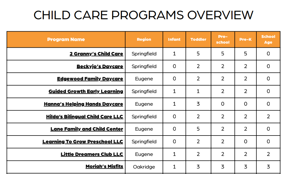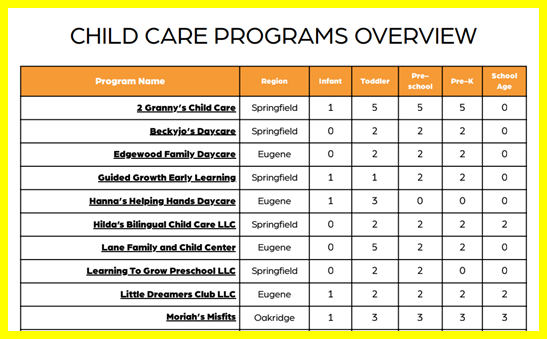 Check out this incredible report<https://www.eugenechamber.com/child-care-resources.html> from the Chamber of Commerce detailing the childcare openings in our area. Updated monthly!