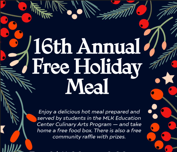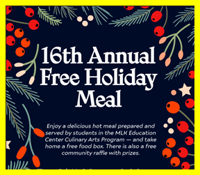 Enjoy a delicious hot meal prepared and served by students in the MLK Education Center Culinary Arts Program — and take home a free food box. We’ll also have a free community raffle with prizes.