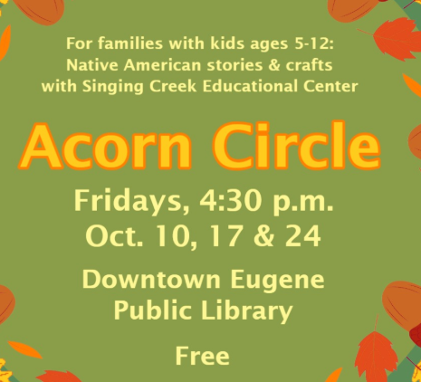 Family with kids ages 5-12: get together for Native American stories and crafts with Acorn Circle at the Downtown Library! Created by The Confederated Tribes of Grand Ronde @ctgrgov<https://www.instagram.com/ctgrgov/> and presented by local non-profit Singing Creek Educational Center @singingcreekctr<https://www.instagram.com/singingcreekctr/>. Each session will feature a book and creative activity:🍁Fri., Oct. 24: Coyote and the Fish Trap