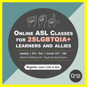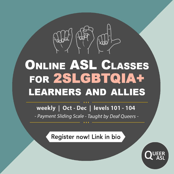 Wanna learn ASL? Queer ASL is a queer + trans positive environment for learning American Sign Language online at a variety of skill levels! Allies welcome!