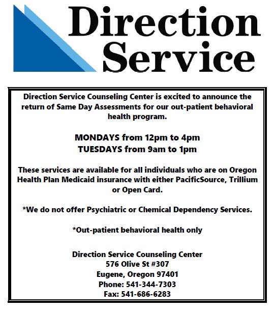 [cid:image009.jpg at 01DC3227.0183A3F0] Direction Service has immediate openings for out-patient mental health counseling for children, adolescents and adults.