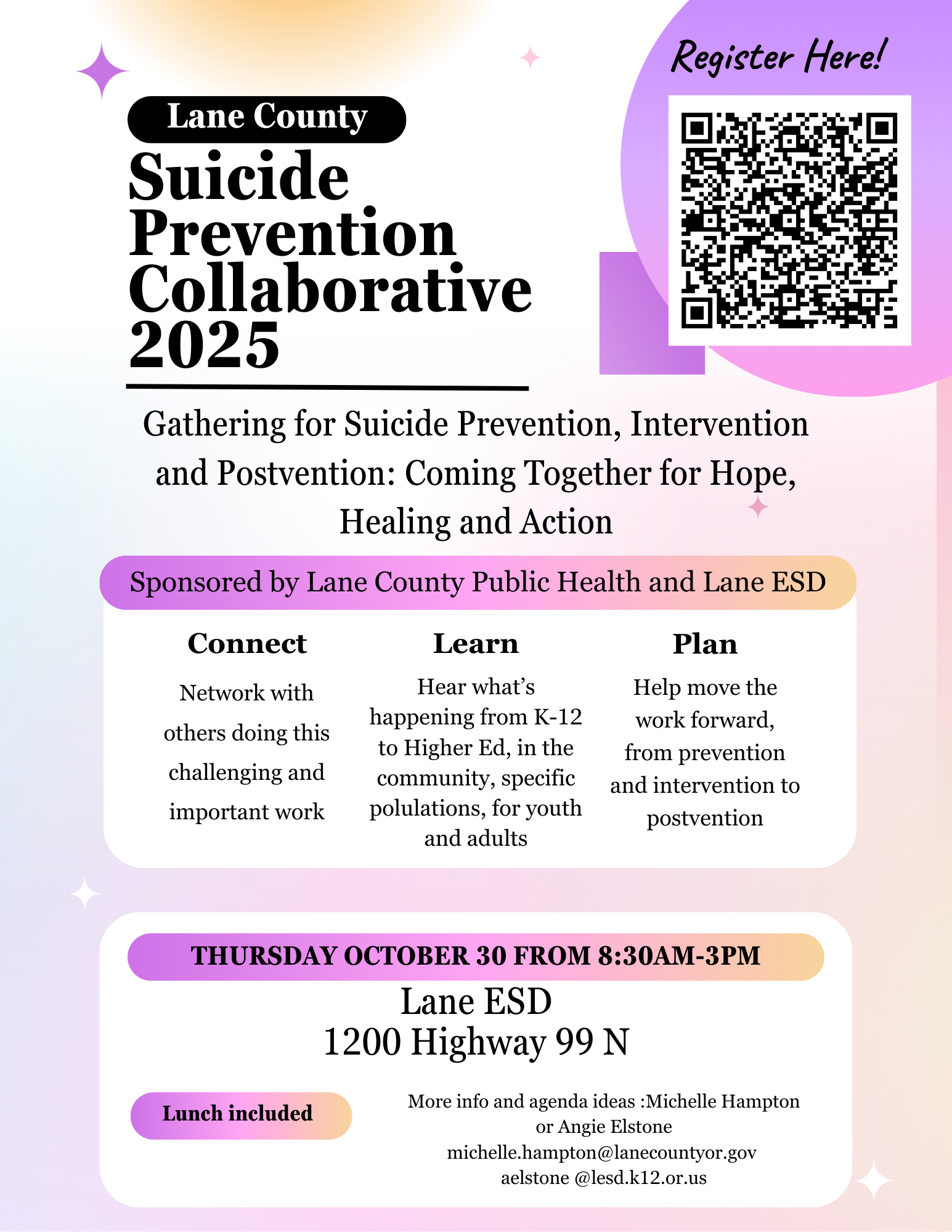 [Lane Education Service District logo: Text LANE with Larger text ESD positioned below with a yellow circle going diagonal through the letters.][cid:image007.jpg at 01DC3227.0183A3F0]Lane ESD (Education Service District) and Lane County Public Health are starting the Suicide Prevention Collaborative 2025 on Thursday October 30th, 8:30 am-3 pm at Lane ESD, 1200 Highway 99N, Eugene.