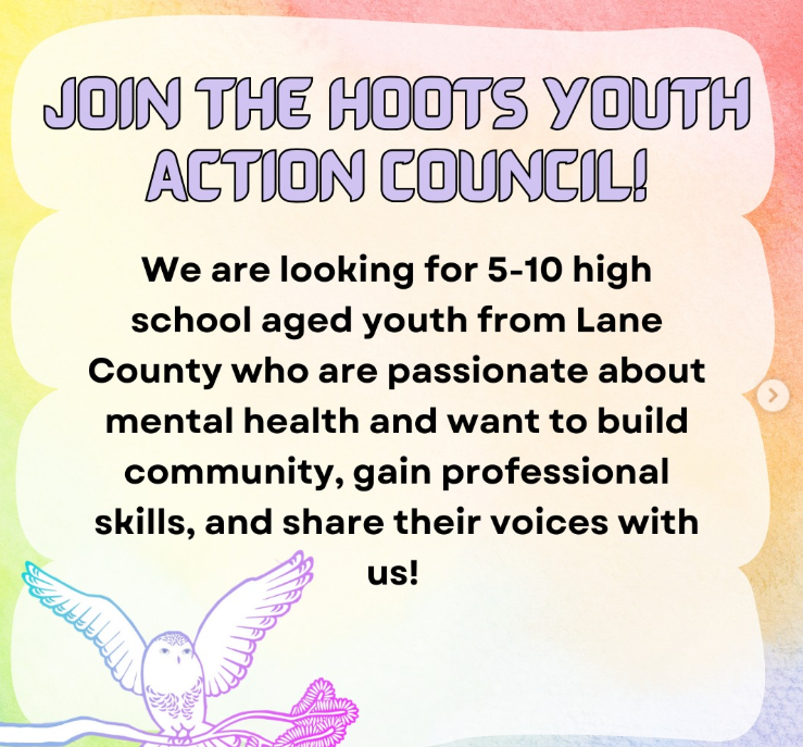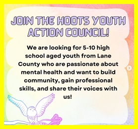 Now is your chance to join the HOOTS Youth Action Council! We are currently recruiting high school aged youth in Lane County who are passionate about mental health to help us combat adultism and better serve the needs of youth in Lane County.