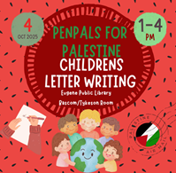 Hey Eugene! We have an activity to connect children across the world. Do you have a kid who would like to brighten the spirits of a child in the West Bank of Palestine? Please join us on October 4th at the Eugene Public Library from 130 to 430! We will be in the Bascom/Tykeson room writing letters to the children in a distressed village in the West Bank.