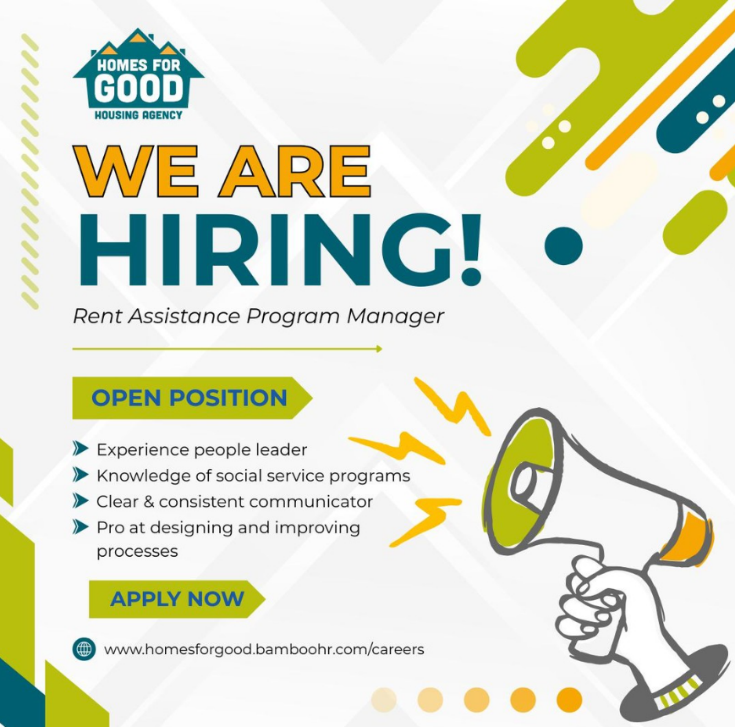 For more information and to Apply use the link: https://www.homesforgood.org/opportunities/job-opportunities/view-openings-and-apply/rent-assistance-program-manager-164