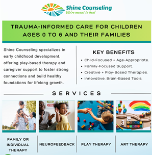 Shine counseling specializes in early childhood development, offering play-based therapy and caregiver support to foster strong connections and build healthy foundations for lifelong growth.
