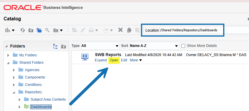 Location in OBIEE: /Shared Folders/Repository/Dashboards/SWB Reports