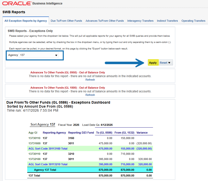 3. Click Apply to load your agency’s reports.