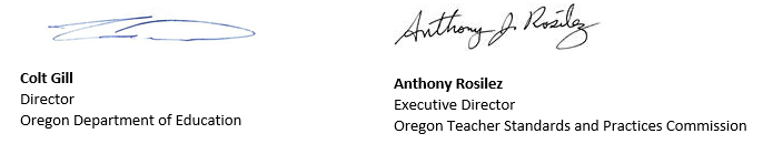 FROM: Colt Gill, Director of the Oregon Department of Education and Anthony Rosilez, Executive Director of Oregon Teacher Standards and Practices Commission