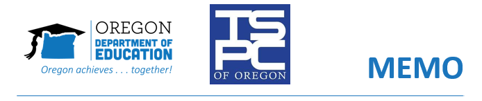 The Oregon plan for the Every Student Succeeds Act has provided an opportunity for TSPC and ODE to work together to build a consistent reporting and licensing structure for educators, school districts and the public. We would like to thank you for your patience and partnership in these efforts.