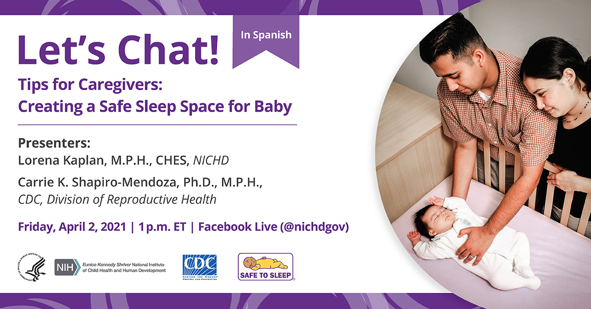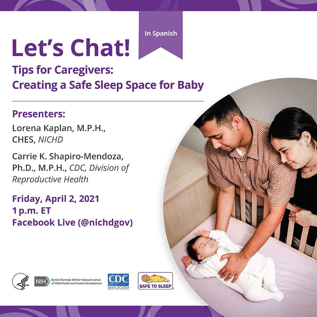 In recognition of National Minority Health Month<https://nam12.safelinks.protection.outlook.com/?url=https%3A%2F%2Fwww.minorityhealth.hhs.gov%2Fomh%2FContent.aspx%3FID%3D12481&data=04%7C01%7Crfournie%40mphi.org%7C483dd96913534bc817bd08d8eedfe73b%7Ca4405b416d4f4d5190dd22ba251725f5%7C0%7C0%7C637521992749199139%7CUnknown%7CTWFpbGZsb3d8eyJWIjoiMC4wLjAwMDAiLCJQIjoiV2luMzIiLCJBTiI6Ik1haWwiLCJXVCI6Mn0%3D%7C1000&sdata=%2FOtTXBz6WnohWTzHOt%2FDst8Jpkph%2BxtvBwqAcijJxG0%3D&reserved=0>, the Eunice Kennedy Shriver National Institute of Child Health and Human Development (NICHD)<https://nam12.safelinks.protection.outlook.com/?url=https%3A%2F%2Fwww.nichd.nih.gov%2F&data=04%7C01%7Crfournie%40mphi.org%7C483dd96913534bc817bd08d8eedfe73b%7Ca4405b416d4f4d5190dd22ba251725f5%7C0%7C0%7C637521992749209132%7CUnknown%7CTWFpbGZsb3d8eyJWIjoiMC4wLjAwMDAiLCJQIjoiV2luMzIiLCJBTiI6Ik1haWwiLCJXVCI6Mn0%3D%7C1000&sdata=BfUwmcls%2F4fRzMS4B3%2Fle5yEcLcX%2BSpcTS9y1Tntsyg%3D&reserved=0> will host a Spanish-language Facebook Live event to talk about how to create a safe sleep environment for baby and answer frequently asked questions about safe sleep from healthcare and service providers, parents, and other caregivers. Lorena Kaplan, M.P.H., CHES, NICHD's lead for the Safe to Sleep® campaign<https://nam12.safelinks.protection.outlook.com/?url=https%3A%2F%2Fsafetosleep.nichd.nih.gov%2F&data=04%7C01%7Crfournie%40mphi.org%7C483dd96913534bc817bd08d8eedfe73b%7Ca4405b416d4f4d5190dd22ba251725f5%7C0%7C0%7C637521992749209132%7CUnknown%7CTWFpbGZsb3d8eyJWIjoiMC4wLjAwMDAiLCJQIjoiV2luMzIiLCJBTiI6Ik1haWwiLCJXVCI6Mn0%3D%7C1000&sdata=YFHKvfOlhQd%2Fp%2BE8t3iuBjpHtwujWN1zRFOu%2B0g6JYE%3D&reserved=0>, and Carrie K. Shapiro-Mendoza, Ph.D., M.P.H., the Field Support Branch chief within the Division of Reproductive Health at CDC will lead the conversation.