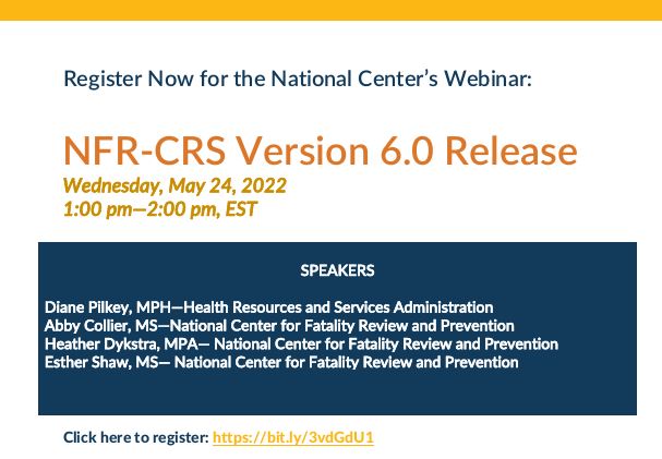 For the past 18 months, the National Center for Fatality Review and Prevention (National Center) has been working on an update to the National Fatality Review-Case Reporting System (NFR-CRS). The update, known as Version 6.0, will be released in early June 2022 and will feature many exciting changes including update cause of death sections, improved user experience and data entry for stillbirths, and two-factor authentication. Join National Center staff on May 24, 2022 from 1:00pm - 2:00pm eastern for a webinar on NFR-CRS Version 6.0. See the attached handout for additional information. This webinar is for all NFR-CRS users, so please share with your network as appropriate. Register for the webinar at https://bit.ly/3vdGdU1.