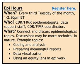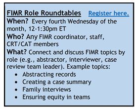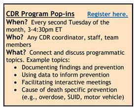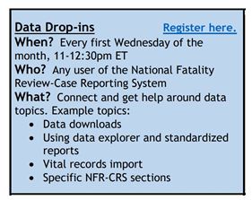 The National Center is pleased to announce the launch of four different, voluntary drop-in opportunities to support FIMR and CDR teams. The opportunities will be offered monthly and will be topic specific: Data Drop-ins; CDR Program Pop-ins; Epi Hours; and FIMR Role Roundtables. Each of the office hours opportunities will briefly highlight a different relevant topic, with the bulk of the time being reserved for open discussion. This will be a great opportunity for shared learning and problem solving. Check out the office hours opportunities and register below. Registering will simply put the office hours on your calendar. Though we certainly welcome you to join, there is no expectation that you will attend.