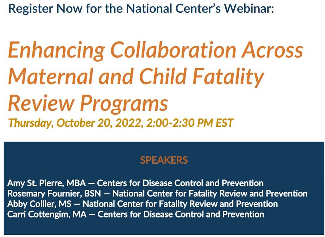 The webinar will introduce a new resource that highlights key considerations and effective collaboration strategies to support maternal mortality review, fetal and infant mortality review, child death review, and Sudden Unexpected Infant Death and Sudden Death in the Young Case Registry activities. For more information, review the attached webinar announcement. Please register for the webinar here: https://bit.ly/3QT1ppp