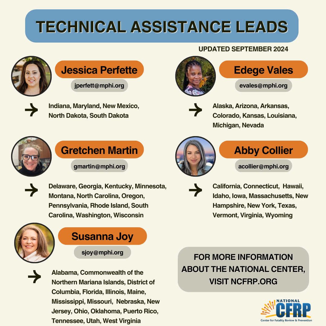 In January 2024, the National Center enhanced the way Technical Assistance (TA) was delivered to fatality review teams. Each state now has a dedicated TA lead who serves as the primary contact. The TA lead will engage other members of the National Center team as appropriate. Please refer to the picture above for updated information on which TA lead your state has. For specific questions, please contact your TA lead.