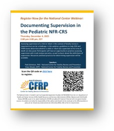 The National Center for Fatality Review and Prevention is pleased to announce registration for the webinar "Documenting Supervision in the Pediatric NFR-CRS," taking place on Thursday, December 4th, from 2:00pm-3:00pm EST.