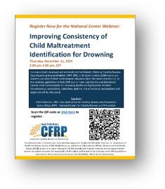 The National Center for Fatality Review and Prevention is pleased to announce registration for the webinar "Improving Consistency of Child Maltreatment Identification for Drowning," taking place on Thursday, December 11th, from 2:00pm-3:00pm EST.