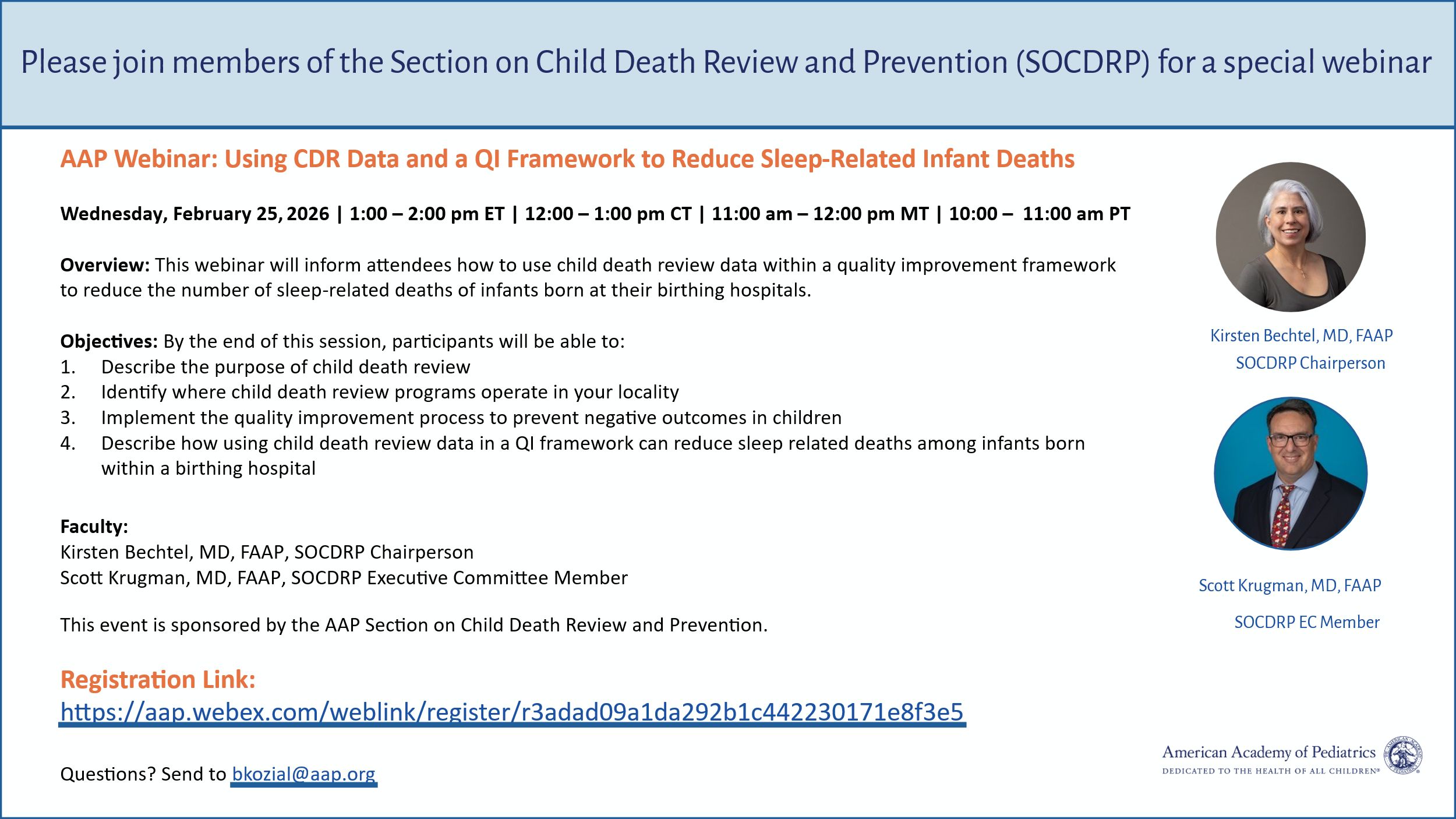 This event is sponsored by the AAP Section on Child Death Review and Prevention. It will be recorded and posted for later viewing.