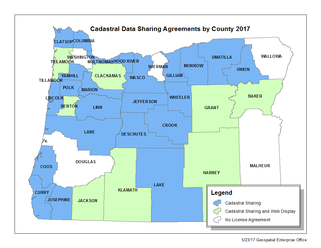 I have attached a graphic showing the counties with license agreements and those that allow web display of non-personally identifiable information on state agency websites.