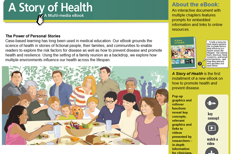 When people get sick or develop a disability, they often ask their health care providers, "How or why did this happen?" In some cases, the answer is obvious. In others, it's more complicated. A Story of Health is a multimedia eBook that explores this question and delves into how our environments interact with our genes to influence health across the lifespan. A Story of Health is told through the lives of fictional characters and their families - Brett, a young boy with asthma; Amelia, a teenager with developmental disabilities; and toddler Stephen, recently diagnosed with leukemia. Each fictional case features the latest scientific research about disease origin and helpful facts about disease prevention. Colorful illustrations, graphics and videos enhance each page. Links to a wide range of additional resources and hundreds of scientific papers enrich each story with information you can use today to promote health and prevent disease.