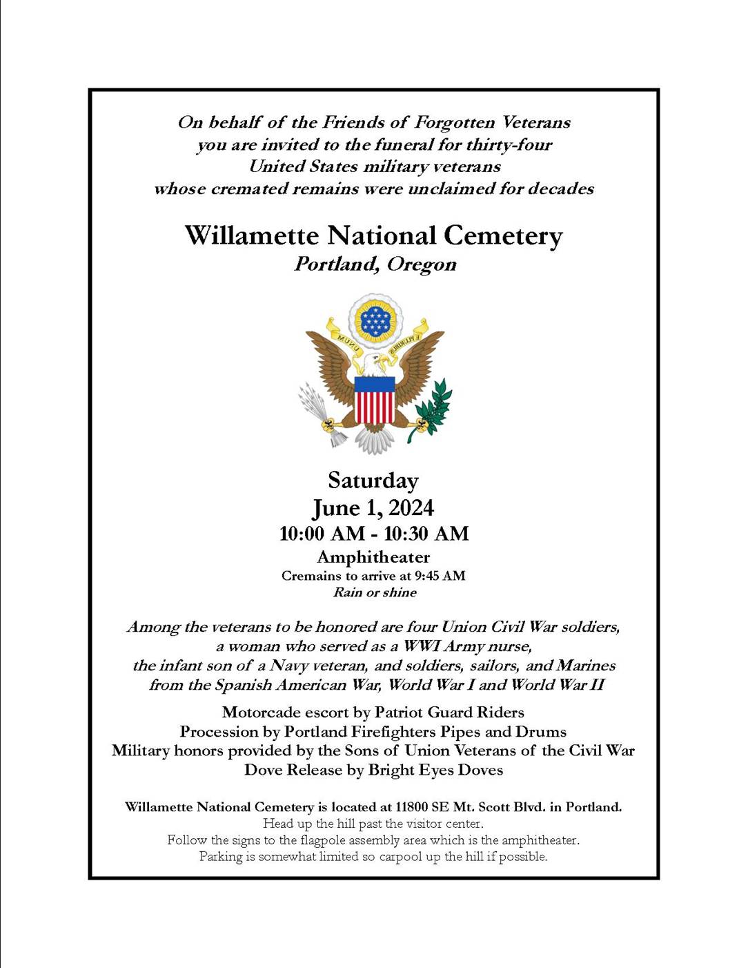 Thirty-four veterans who's unclaimed cremains have been in storage for decades (one of the Civil War vets has been in storage over 100 years) will receive a funeral on June 1st at Willamette National Cemetery.