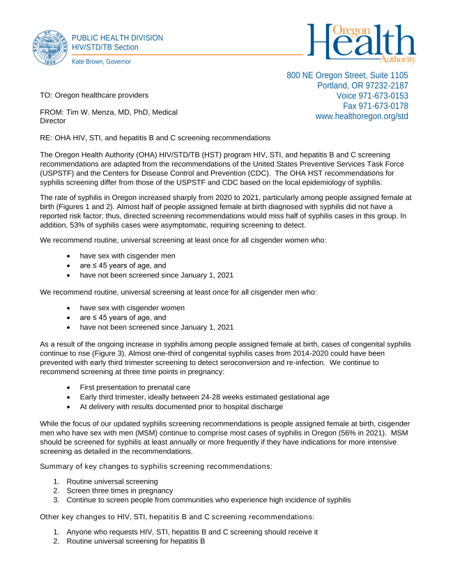 View the 2022 Orego<https://gcc02.safelinks.protection.outlook.com/?url=https%3A%2F%2Fr20.rs6.net%2Ftn.jsp%3Ff%3D001WHSEzEcEfrBMrD3I1Dm3luFeKJFay1uCRBRsAWHJRwmpR0cCCxk60pqVNR3PAiIrw5aCGN8vaRQdFNZMv1lw5jyLAG1dPArAQfmPLdu-k4WydLaCAfdg3m5CqcNkiW524S9_YJlEndGenigG2VfBuMIek4HB-58uzUNQLm3vT1U0z-FcUGLeQBWYiozi8QGTpPDcTaJs3FzfCPsEqrQpN4hrsv1FHTYgWALnHB-QKCC20PAneR2PzQ%3D%3D%26c%3Dz2FIXoomZ1lYqFC-Wghn-RZZ-gTG8G_sciOCMItXQVBMtDFS5_vFtw%3D%3D%26ch%3DdUjHWnhnjlZz3xDBzw43SHqWE7iHpPbyBDS9GyH2R8twO14ks1Ex_w%3D%3D&data=05%7C01%7Cjillian.d.garai%40dhsoha.state.or.us%7Cb3af6fd10cae4330b1e208da8449731d%7C658e63e88d39499c8f4813adc9452f4c%7C0%7C0%7C637967748285534314%7CUnknown%7CTWFpbGZsb3d8eyJWIjoiMC4wLjAwMDAiLCJQIjoiV2luMzIiLCJBTiI6Ik1haWwiLCJXVCI6Mn0%3D%7C3000%7C%7C%7C&sdata=fhASgKnQV9oz68hrYO5c%2F5SQ5V%2Fa%2FJVTxHl5dChzVuU%3D&reserved=0>n STI Screening Recommendations<https://gcc02.safelinks.protection.outlook.com/?url=https%3A%2F%2Fr20.rs6.net%2Ftn.jsp%3Ff%3D001WHSEzEcEfrBMrD3I1Dm3luFeKJFay1uCRBRsAWHJRwmpR0cCCxk60pqVNR3PAiIrw5aCGN8vaRQdFNZMv1lw5jyLAG1dPArAQfmPLdu-k4WydLaCAfdg3m5CqcNkiW524S9_YJlEndGenigG2VfBuMIek4HB-58uzUNQLm3vT1U0z-FcUGLeQBWYiozi8QGTpPDcTaJs3FzfCPsEqrQpN4hrsv1FHTYgWALnHB-QKCC20PAneR2PzQ%3D%3D%26c%3Dz2FIXoomZ1lYqFC-Wghn-RZZ-gTG8G_sciOCMItXQVBMtDFS5_vFtw%3D%3D%26ch%3DdUjHWnhnjlZz3xDBzw43SHqWE7iHpPbyBDS9GyH2R8twO14ks1Ex_w%3D%3D&data=05%7C01%7Cjillian.d.garai%40dhsoha.state.or.us%7Cb3af6fd10cae4330b1e208da8449731d%7C658e63e88d39499c8f4813adc9452f4c%7C0%7C0%7C637967748285534314%7CUnknown%7CTWFpbGZsb3d8eyJWIjoiMC4wLjAwMDAiLCJQIjoiV2luMzIiLCJBTiI6Ik1haWwiLCJXVCI6Mn0%3D%7C3000%7C%7C%7C&sdata=fhASgKnQV9oz68hrYO5c%2F5SQ5V%2Fa%2FJVTxHl5dChzVuU%3D&reserved=0>