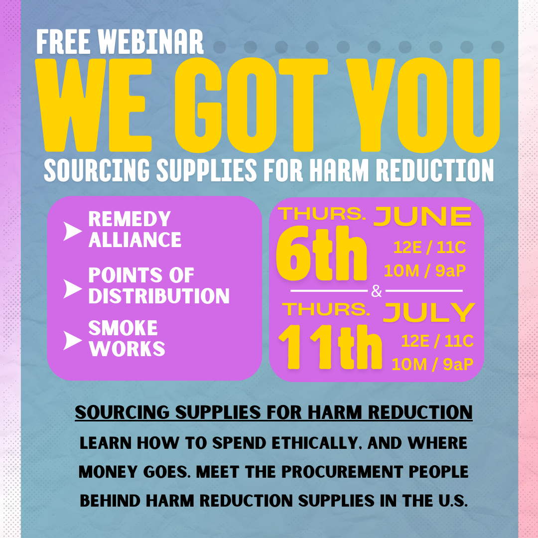 Please see below for information about "We Got You: Sourcing Supplies for Harm Reduction<https://us06web.zoom.us/webinar/register/WN_FHKfX44KR46Hm_yFUhZFsA>: a webinar with Remedy Alliance, Points of Distribution, and Smoke Works." The webinar will be held on July 11th at 12E/11C/10M/9aP.