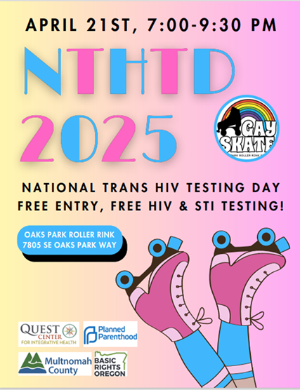 NTHTD will be from 7-9:30 p.m. on Monday, April 21 at Oaks Park. Free roller skating for all! Free anonymous testing from Multnomah County will also be available.