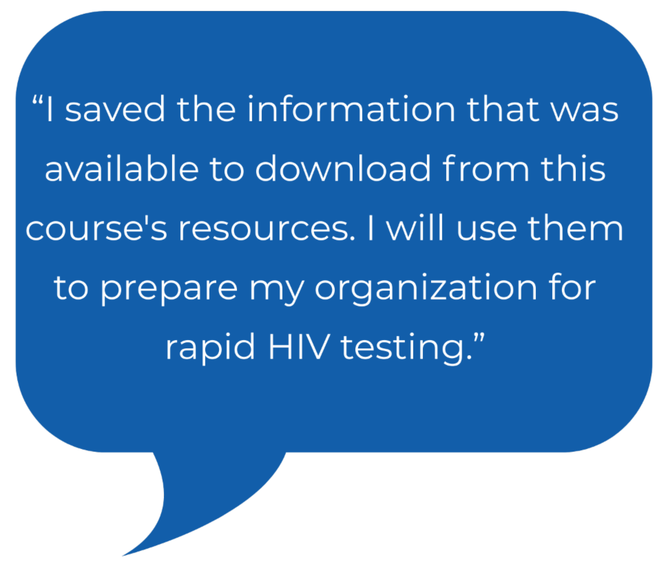 This course prepares rapid HIV testing staff to conduct the key steps of rapid HIV testing: setting up a workspace, conducting the rapid HIV test, preparing clients for the test and delivering test results, and conducting quality assurance activities.