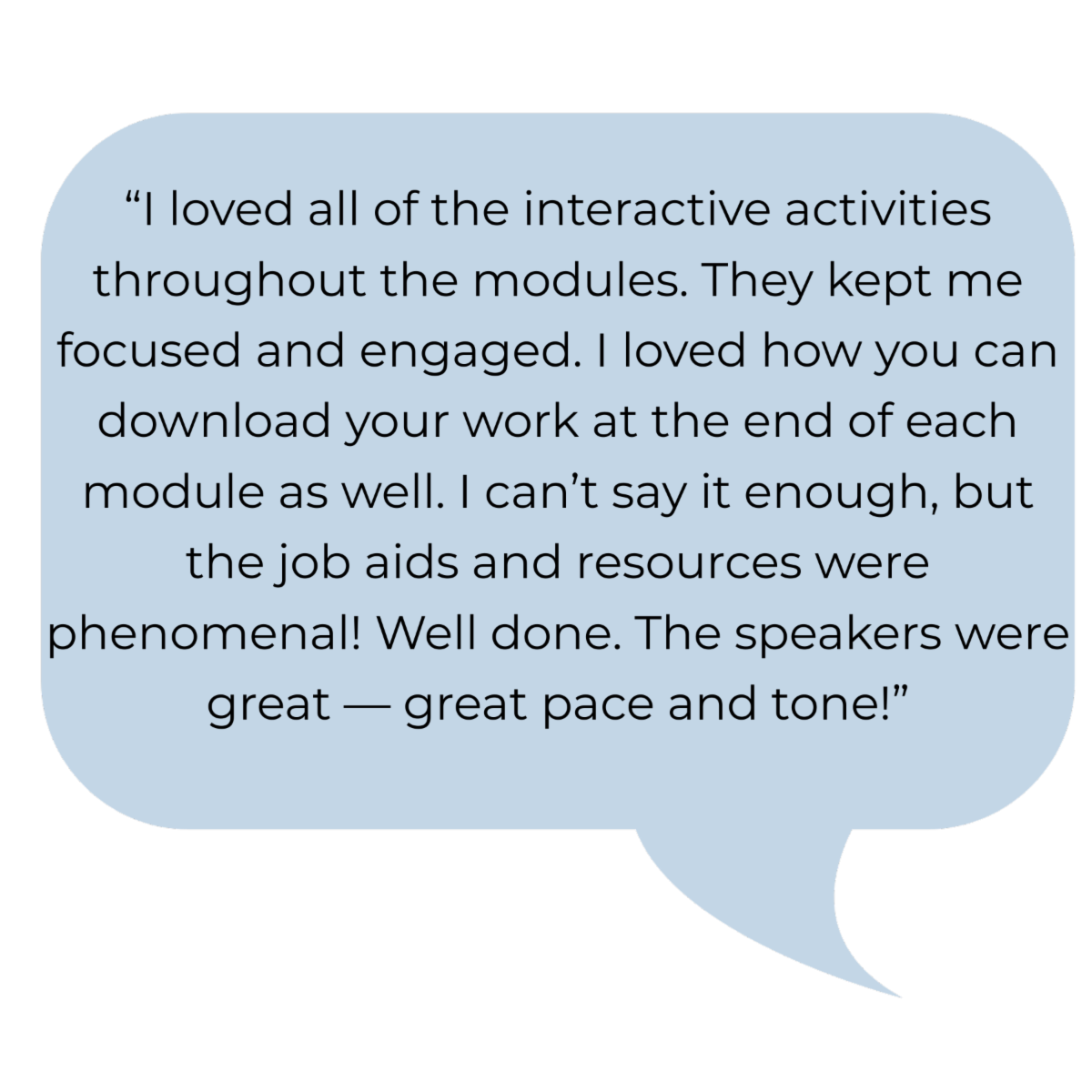 Participants also have opportunities to reflect on how they can use what they’ve learned and apply it to their current work. Learners may save their reflections for the future as they grow their knowledge in the field.