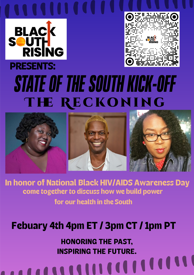From Black South Rising: In honor of National Black HIV/AIDS Awareness Day, Black South Rising has put together an amazing panel to present on some of the legislative and political attacks on Black people in the South, tie them to the political determinants of health, and discuss ways we can collectively fight for our power to improve our people’s health. Register Here: