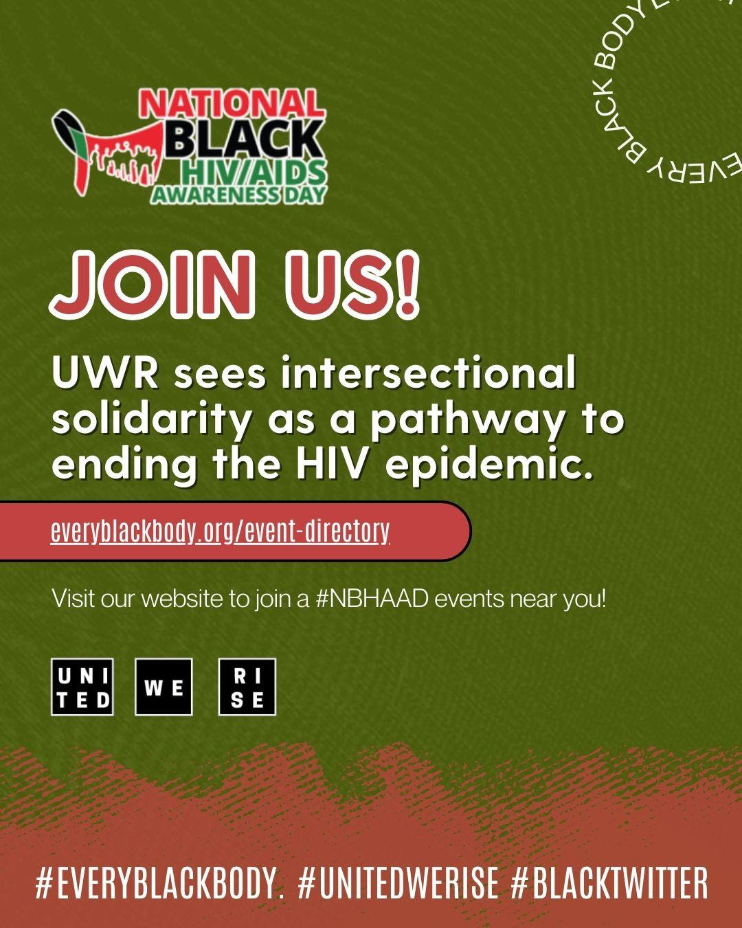 From United We Rise: National Black HIV/AIDS Awareness Day (NBHAAD) is approaching on February 7th, and United We Rise hosts a virtual campaign each year. You can find a list of events on the NBHAAD calendar<https://www.everyblackbody.org/event-directory/>. If you are hosting an NBHAAD event that is not on the calendar, we encourage you to submit your event details<https://www.everyblackbody.org/event-submission-form/> to share with our network later.
