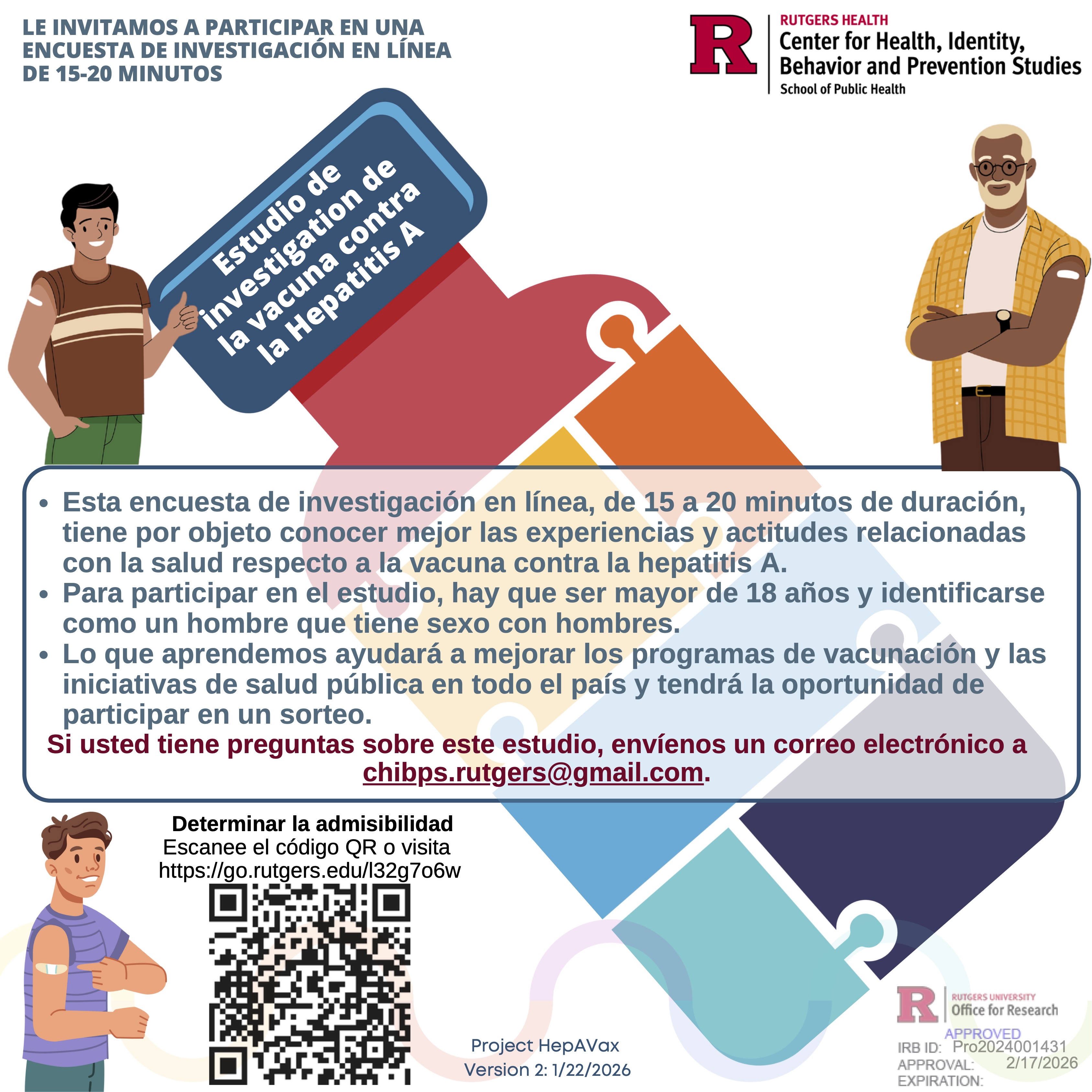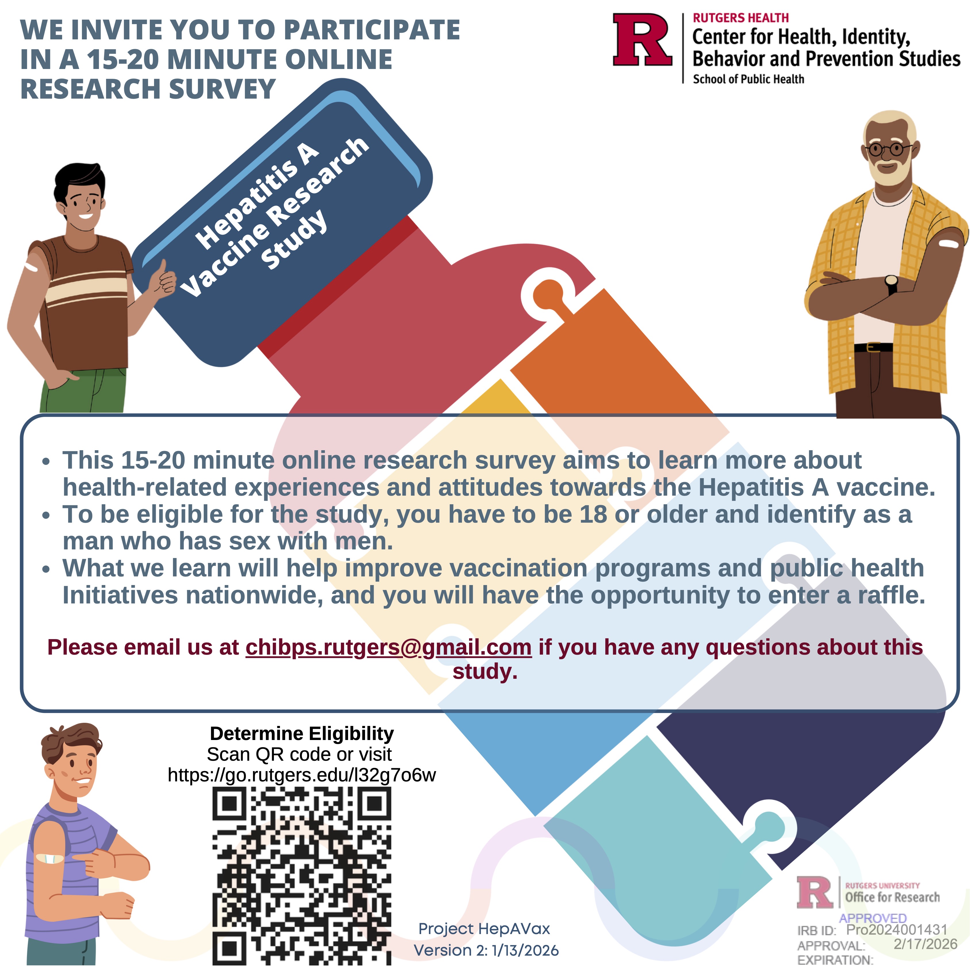 The Center for Health, Identity, Behavior and Prevention Studies (CHIBPS) at the Rutgers School of Public Health is reaching out to organizations nationwide with the hope you can help us recruit individuals for a 15–20-minute online survey that explores health-related experiences and attitudes towards the Hepatitis A vaccine among sexually diverse individuals.