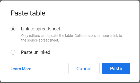 TIP: Not all spreadsheets are suitable to embed in a Doc. For instance, if you have more than 400 cells Google will allow them to be copied and pasted, but they will not be linked.