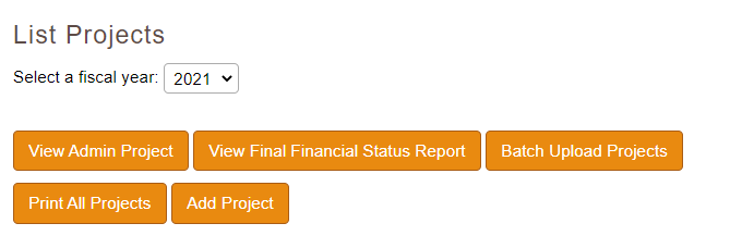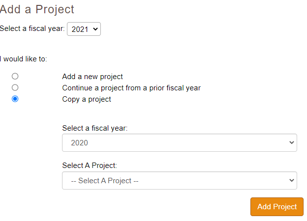 The next screen gives the option to copy a project from a prior year. Click copy a project. Then select the fiscal year you want to copy. It takes a few seconds for the projects to load to be able to select them.