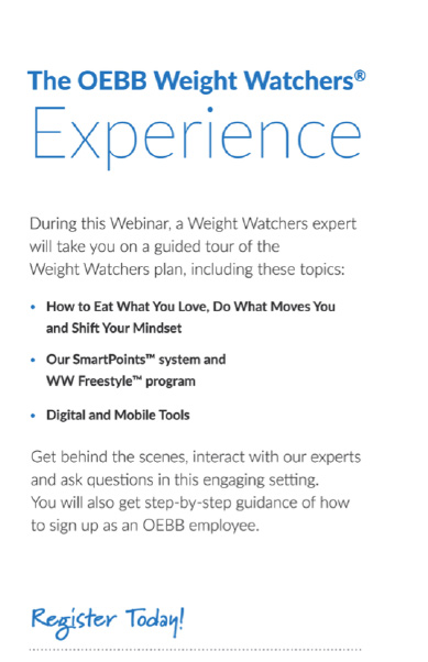 This Thursday, June 7, at 3:30 p.m. Pacific Time Zone, Weight Watchers is hosting a special webinar just for OEBB Members to explain how the program works and how you can participate for FREE with your OEBB medical plan. If the date/time are not convenient for you, but you'd like to watch a recording of this webinar after it's over, please register anyway. You can click the registration link in the invitation below, or copy & paste this URL into your browser address bar to get to the registration page: