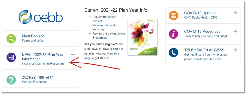 under the OEBB logo and "Most Popular" member links. We hope you find this a convenient starting point guiding you to all the information needed for your 2022-23 plan year decisions.