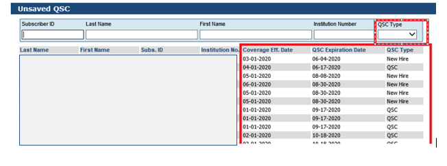 Unsaved QSC - This will show all unsaved QSC's. You can filter by New Hire only. This will show you the coverage effective date and when the QSC will expire. Remember, the employee only has 31 days to complete a New Hire QSC through the Member Module. After that the Entity Admin will have to complete. Any other QSC must be completed by entity admin. This includes change of employment, active to retiree, marriage, birth, etc.