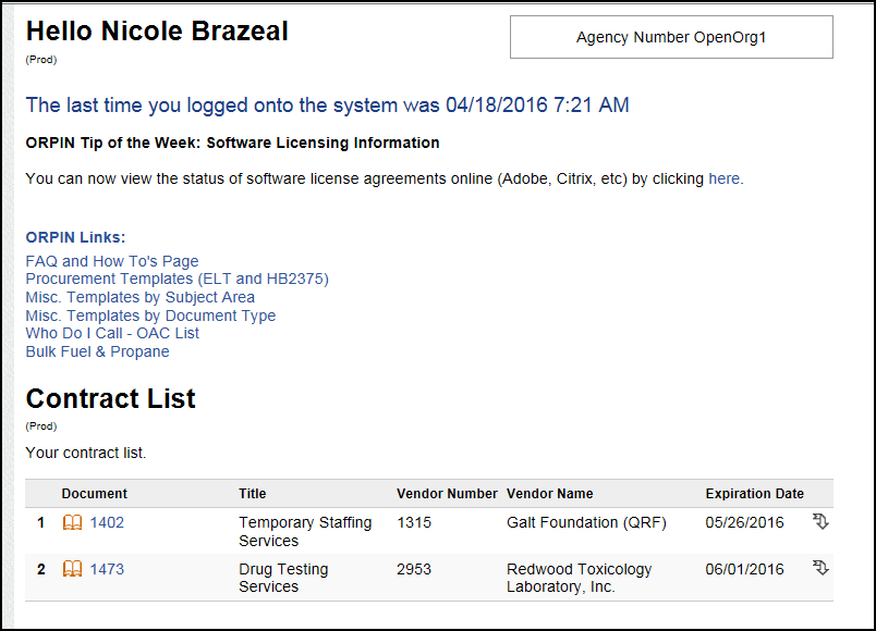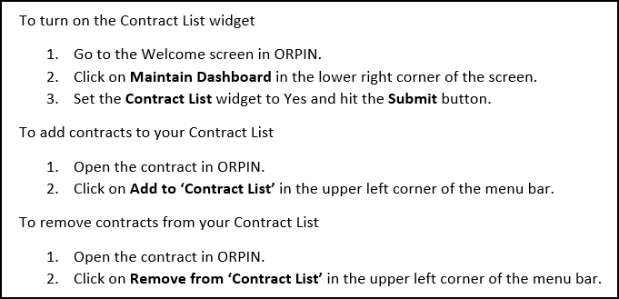 2. The patch items we discussed during the March meeting were installed into Production on Saturday, April 16th. My favorite is the new Contract List widget - you can mark commonly used contracts as "favorites" and then access them right from your welcome screen when you log in. You can even create Work Orders against those contracts right from the widget itself - very handy! Here are the instructions for the Contract List: