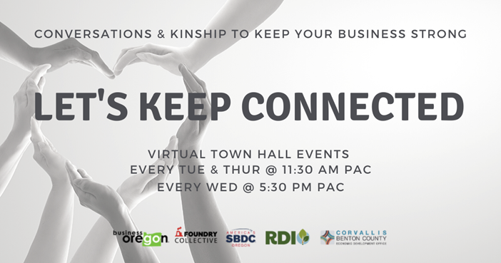 A group of service providers including Foundry Collective, Corvallis Benton County Economic Development, SBDC, RDI and others have launched Let's Keep Connected virtual town hall events. Please feel free to share this info with your small business owners.