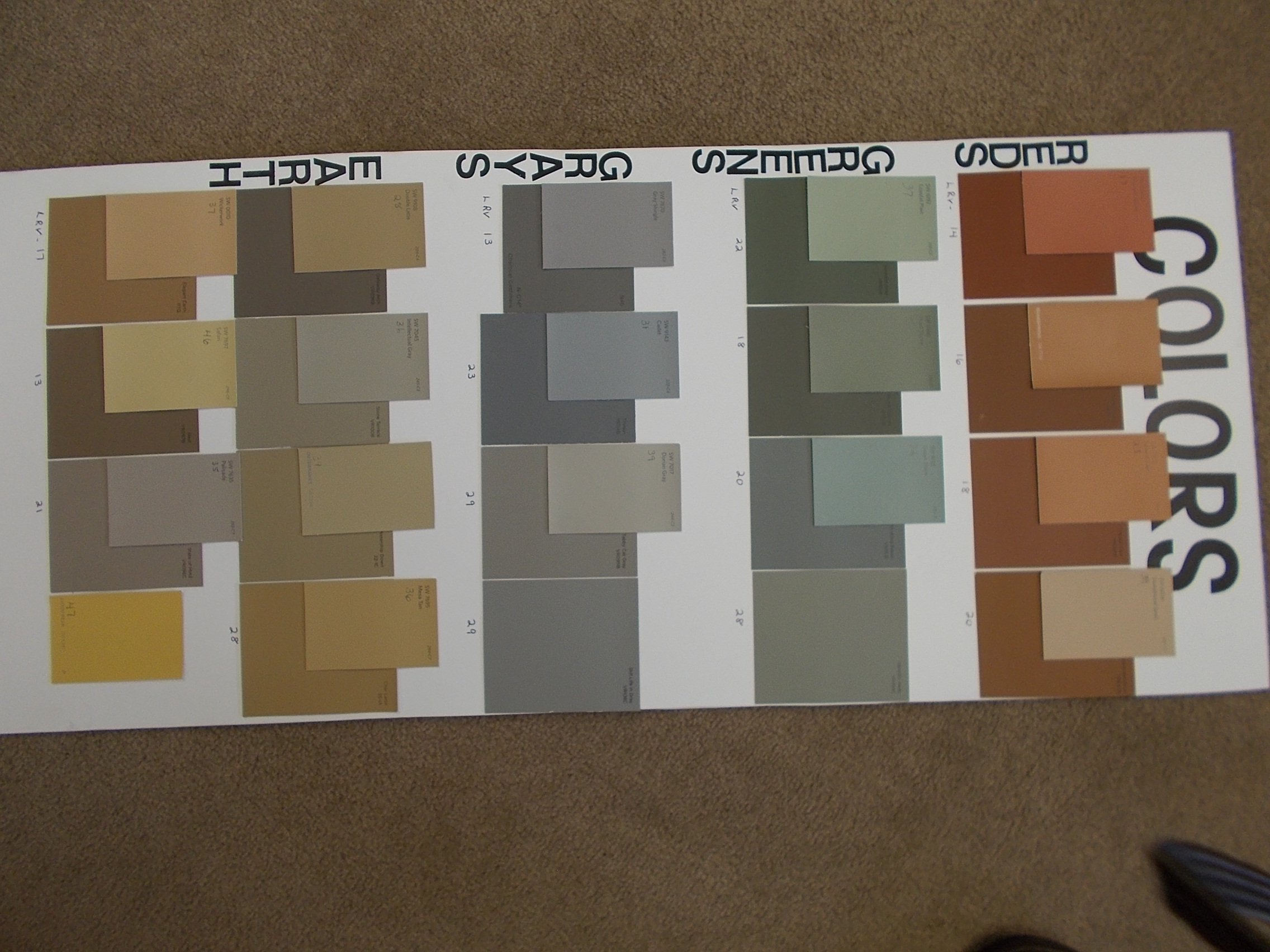 And I keep two copies of the foam board in my office for reference. I have attached the handout I have produced to explain the color regulation and a photo of the foam board. While I have no allegiance to any one brand of paint, I do note that Sherwin Williams does identify the Light Reflecting Value of each color on their paint chips. I keep the complete Sherwin Williams paint wheel in the office and can compare a chip from other brands to Sherwin Williams colors and determine compliance with the LRV requirement.