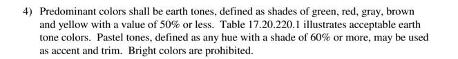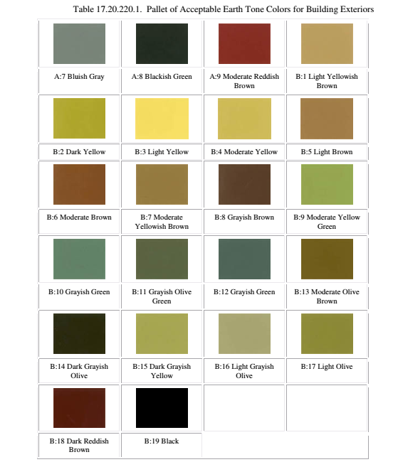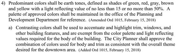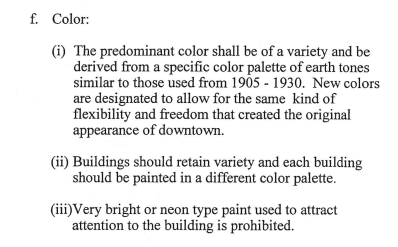 After completing a downtown plan, as we were drafting the implementing regulations, the Planning Commission wanted to continue to regulate color in the downtown area and keep the “earth tone” theme, so I developed the following language in the Code: